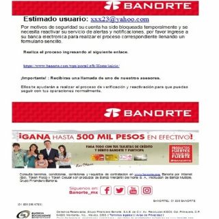 En esta ocasión, el correo apócrifo de Banorte señala que por motivos de seguridad la cuenta del usuario ha sido bloqueada temporalmente, por lo que es necesario llenar un formulario para desbloquearla ingresando a un enlace e incluso menciona que posteriormente asesores del banco se comunicarán con el usuario.