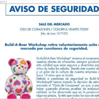 CIUDAD DE MÉXICO (29/DIC/2011).- La empresa Build-A-Bear Workshop inició el retiro voluntario del 'Oso de corazones' (colorful hearts teddy), por ser un artículo riesgoso para la seguridad de los niños, informó Procuraduría Federal del Consumidor (Profeco).