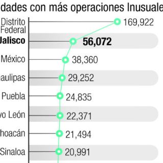 Jalisco es el segundo Estado con más operaciones inusuales detectadas por la UIF en el periodo 2007-2013, con 56 mil 072, sólo después del Distrito Federal (169 mil 922). En este apartado también se consideran los comportamientos transaccionales de usuarios que repentinamente se salen por completo de su patrón habitual, ya sea que varíen el monto o la frecuencia de sus movimientos financieros, o que resulten extraños a sus actividades económicas declaradas.