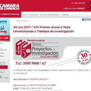 GUADALAJARA, JALISCO (14/JUN/2017).- Con el objetivo de que las tesis o proyectos de titulación, que tengan como objetivo el desarrollo social, puedan ser reconocidos y apoyados por empresarios jaliscienses, desde hace 45 años se realiza el Premio Anual de Tesis Universitarias, por parte de la Cámara de Comercio de Guadalajara.