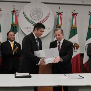 CIUDAD DE MÉXICO (08/SEP/2016).- El secretario de Hacienda, José Antonio Meade, entregó al presidente de la Cámara de Diputados, Javier Bolaños, el Paquete Económico 2017 para su análisis, discusión y aprobación, resaltando que en este se refleja una reducción al gasto de 239 mil 700 millones de pesos.