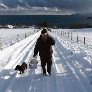 DUBLÍN, IRLANDA (23/DIC/2010).-Un granjero del Norte de Irlanda habla por su teléfono celular mientras camina por la nieve. Los futuros de crudo en Estados Unidos subieron ayer por cuarta sesión consecutiva y alcanzaron un máximo de 26 meses de casi 91 dólares el barril, impulsados por una caída en los inventarios petroleros motivada por las bajas temperaturas en el Hemisferio Norte.
