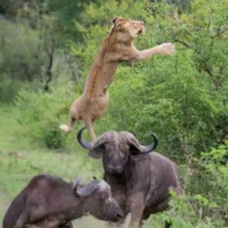 Sudáfrica, tras acechar a una manda de búfalos, un grupo de leones logran derribar a uno de sus integrantes.