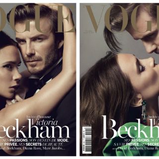 En la portada de la revista, Victoria luce un colorido vestido verde que acompaña con unos pendientes de esmeraldas y brillantes, mientras que David Beckham porta un elegante esmoquin y muestra una cabellera que cae.