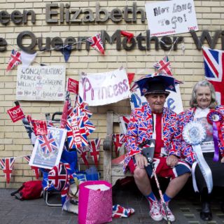 Ante el hospital St. Mary han acampado cinco admiradores portando banderas británicas, a la espera del nacimiento del que será -sea niño o niña- cuarto en la línea de sucesión a la corona británica.