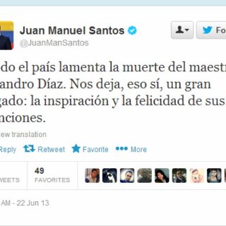 El presidente colombiano Juan Manuel Santos lamentó el fallecimiento del artista en un mensaje en su cuenta de Twitter. "Todo el país lamenta la muerte del maestro Leandro Díaz. Nos deja, eso sí, un gran legado: la inspiración y la felicidad de sus canciones", escribió el mandatario.