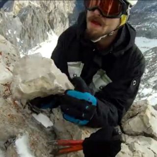 Cuatro personas suben al Zugspitze, en los Alpes y, con picos y distintas herramientas, consiguen aparentemente hacerse con una roca que meten en una mochila antes de emprender el descenso.