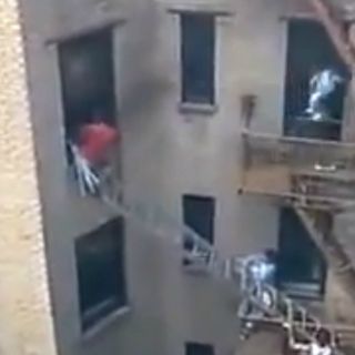Al verlo, un joven que había estado ayudando con la escalera y que se encontraba en el edificio de enfrente, hizo lo mismo buscando crear un puente improvisado y bastante inestable para salvar al desesperado hombre.