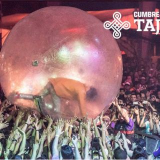 Y fue justo con el último tema el que más emocionó a la gente, pues Cayne salió al escenario dentro de una esfera de plástico y se paseó por encima de la gente, mientras la euforia se mantuvo.