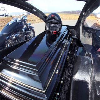 Joerg Grossman afirmó el viernes que su prototipo de coche fúnebre para los entusiastas de las motos que quieren viajar hasta el fin en su vehículo favorito debutó el mes pasado. Se trata de un sidecar especial adaptado a su motocicleta.
