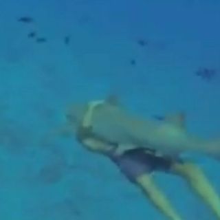 En la grabación se ve cómo el joven, sin llevar algún tipo de protección nada muy de cerca con un par de tiburones, a uno de los animales se acerca demasiado y lo abraza por la parte del estómago, dejando su rostro a sólo unos centímetros de la poderosa mandíbula del tiburón.