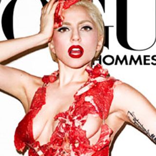 Con el título de Lady Gaga "The Naked Truth" (La verdad desnuda), la intérprete aparece en la portada de Vogue Hommes Japan con una prenda hecha con trozos de carne roja.