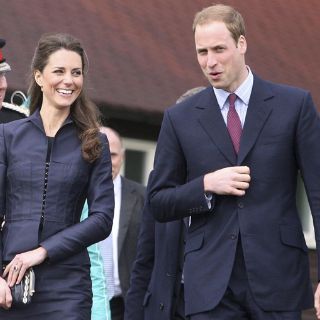 Ataviada con un traje de dos piezas azul marino y guareciéndose de la lluvia con un paraguas, Middleton llegó sonriente junto con su prometido para atender el acto y saludar a los presentes.
