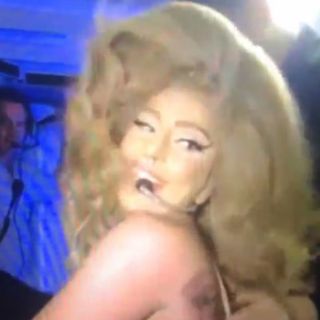 La cantante fue captada mientras caminaba fuera del escenario, portando sólo playera, tanga, medias de red y tacones.