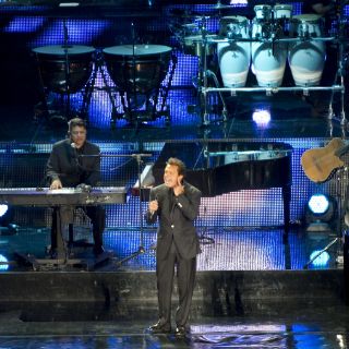 Con una orquesta conformada por 15 músicos y dos coristas, y en el escenario una pantalla central y varios páneles, el cantante inició la velada para beneplácito de sus seguidoras, en su mayoría mujeres, vistiendo un traje, camisa, corbata y hasta pañuelo negros.