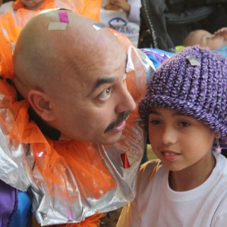 Acompañados de sus familiares, los pequeños convivieron con el cantante, quien poco a poco se fue quitando la peluca, nariz y traje multicolor, para dar a los niños un momento de mayor emoción.