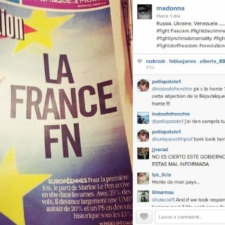 "Rusia, Ucrania, Venezuela ¿y ahora Francia? Combatamos el fascismo, combatamos las discriminaciones", publicó el lunes Madonna, junto a una portada del diario francés "Libération" dedicada a la victoria en Francia del partido de Marine Le-Pen en los comicios europeos del 25 de mayo.