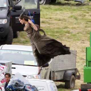 LONDRES, INGLATERRA (27/JUN/2012).- Luego de darse a conocer la imagen oficial de Angelina Jolie como la bruja "Maléfica", se han revelado algunas fotografías de la actriz durante la filmación, en las que aparece colgada con ayuda de una grúa.