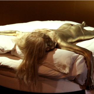 En el mismo espacio que resguarda la exhibición "Designing 007: 50 Years of Bond Style", la muestra más grande en el mundo dedicada al super agente secreto, destacan también un maniquí dorado recostado sobre una cama que gira, y que recuerda el cuerpo de la famosa chica Bond Jill Masterson interpretado en la película "Goldfinger" (1964) por la actriz Shirley Eaton.