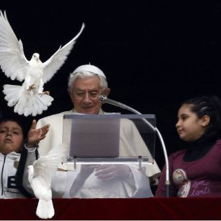 CIUDAD DEL VATICANO (29/ENE/2012).- El papa Benedicto XVI liberó el domingo al término del Angelus dos palomas, símbolo de la paz, pero éstas rechazaron emprender vuelo en un primer momento, provocando un comentario divertido del soberano pontífice.