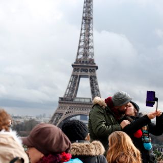 Parejas se besan en la Torre Eiffel en San Valentín