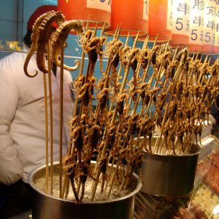 Cualquier guía sobre China aconseja visitar este mercado pequinés y es habitual ver a extranjeros, y también a locales, fotografiándose o grabando en video la experiencia de probar un saltamontes frito o una lagartija con los tradicionales farolillos rojos de fondo.