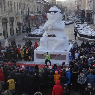 BEIJING, CHINA (27/DIC/2012).- Luego de que Psy convirtiera el video de su tema "Gangnam style" en el más visto en Internet, al alcanzar las mil millones de reproducciones, el cantante surcoreano fue presentado en una figura gigante en Harbin, China, como parte del Festival Internacional de Esculturas de Hielo y Nieve.
