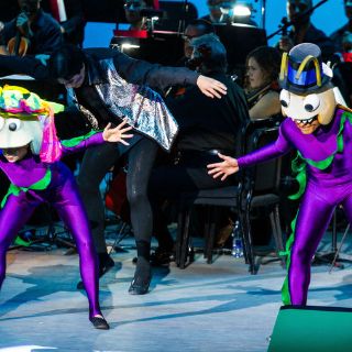 La orquesta estuvo acompañada por un ensamble vocal de dos sopranos, dos tenores, dos barítonos y un mezzo soprano apoyada por proyecciones, actores, bailarines y títeres