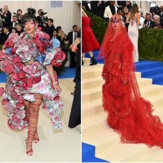 La cantante de Barbados llevó un look de Comme des Garçons modelado originalmente por Anna Cleveland, con motivos florales.