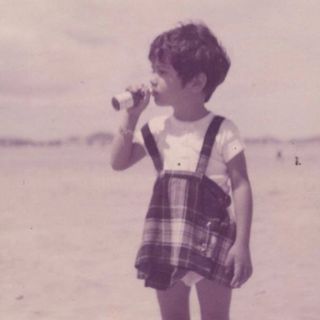 La imagen en blanco y negro muestra a Salma con el cabello corto y una falda de tirantes, así como playera blanca y tomando algo.