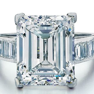 El anillo de 7.45 quilates de corte esmeralda, diseñado por Harry Winston, es aproximadamente del tamaño de un sello de correos. Fue adquirido en forma anónima por vía telefónica.