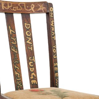 Antes de que Rowling donara la silla a la subasta "Chair-rish a Child" en apoyo a la Sociedad Nacional para la Prevención de la Crueldad Infantil en el 2002, escribió con pintura en partes de la madera "Puede que no te parezca bonita pero no me juzgues por lo que ves". También firmó el respaldar en dorado y rosado y agregó en el borde del asiento: "Escribí Harry Potter mientras estaba sentada en esta silla".