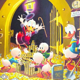 LOS ANGELES, ESTADOS UNIDOS (03/AGO/2010).- Una serie de pinturas al óleo, realizadas por Carl Barks, ex dibujante de la casa Disney, saldrá a la venta en una subasta coordinada por Heritage Auctions. Se estima que las obras superen los 700 mil dólares. Las piezas, entre las que se encuentra Los derrochadores del tiempo (1975), en la que se muestra a Hugo, Paco y Luis, junto a su tío Donald y Rico McPato en la bóveda, así como El experto, también de 1975, en el que se representa la avaricia del acaudalado personaje, o bien La suerte del Norte (1973) y Mucho donde elegir (1983), provienen de la colección del ejecutivo de radio Baltimore, Kirby Confer. El próximo 6 de agosto se darán a conocer los montos alcanzados por las piezas.