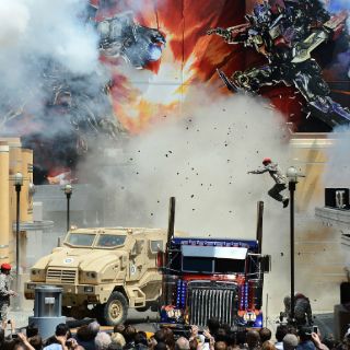 Por unos instantes, las calles del parque simularon una operación militar para proteger la codiciada fuente de energía "All-Spark" que ambicionan los malvados Decepticons, una escenografía en la que no faltaron extras descolgándose de las paredes y explosiones.