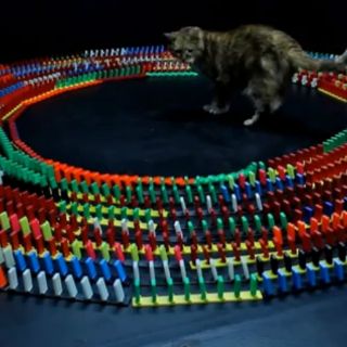 El felino está situado en el centro de una rueda de fichas que van cayendo una tras otra mientras el gato sigue el movimiento con curiosidad y paciencia.