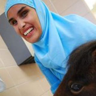 Mona Ramouni acude a Universidad del Estado de Michigan en Lansing ayudada por un poni que le sirve de guía