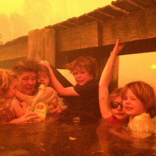 Tammy Holmes, la abuela que aparece en la imagen abrazando a sus cinco nietos, decidió refugiarse debajo de un muelle para protegerse de las llamas que devastaban el poblado de Dunalley.