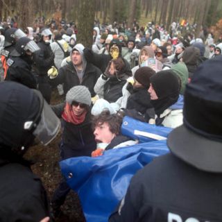 Efectivos de las fuerzas de seguridad alemanas han empleado violencia y material antidisturbios al menos en dos ocasiones para tratar de impedir que los manifestantes bloqueasen las vías por las que debe pasar el tren.