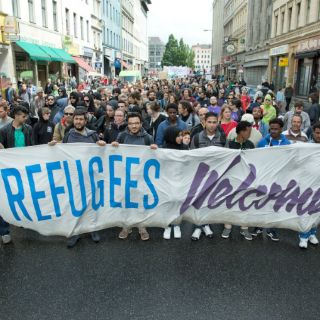 En calma, la muchedumbre coreó eslóganes promigrantes, constató un fotógrafo. "No a las fronteras, no a las naciones, detengan las deportaciones" y "Díganlo fuerte y claramente, los refugiados son bienvenidos aquí", fueron los más reiterados.