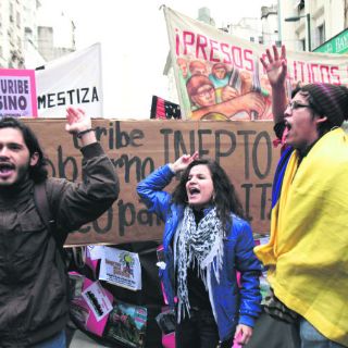Unos 200 manifestantes, entre ellos colombianos residentes en Argentina y militantes de izquierda, se acercaron en una marcha hasta el teatro Rex para protestar por la presencia de Uribe. Un nutrido cordón policial a una cuadra del recinto le impidió avanzar al grupo que gritaba consignas como “Uribe fascistas, vos sos el terrorista”.