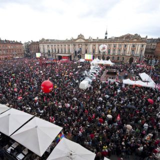PARÍS, FRANCIA (05/ABR/2012).- La Policía de Toulouse evacuó hoy una plaza de esta ciudad después de haber recibido por teléfono una alerta de bomba en ese lugar, donde acababa de finalizar un mitin del candidato del Frente de Izquierda para las elecciones presidenciales francesas, Jean-Luc Melenchon.