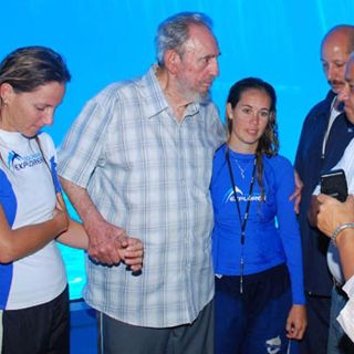 A Castro, quien cumplirá 84 años el 13 de agosto próximo, se le observa ofreciendo una entrevista a los medios cubanos al lado de dos entrenadoras acuáticas del acuario.