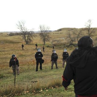 DAKOTA DEL NORTE, ESTADOS UNIDOS (27/OCT/2016).- Agentes de policía en uniforme antimotines dispararon munición no letal y aerosol pimienta el jueves en su intento por despejar a los manifestantes que acampaban en propiedad privada para bloquear la construcción del oleoducto Dakota Access.