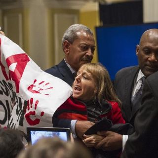 La comparecencia fue interrumpida por dos activistas del grupo CodePink, que acusaron a la NRA (por su sigla en inglés), de "tener sangre en sus manos", y pidieron la prohibición de las armas de asalto.