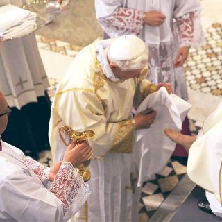 La tarde de ayer, el Papa presidió la celebración “in coena domini” en recuerdo de la última cena y durante la cual cumplió el rito del lavado de los pies a 12 curas (imagen).