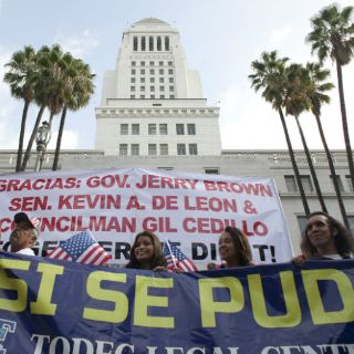 El gobernador firmó la ley en el Ayuntamiento de Los Ángeles con la presencia de cientos de activistas de derechos de los inmigrantes, así como el alcalde Eric Garcetti, el jefe policial Charlie Beck y el arzobispo José Gómez.