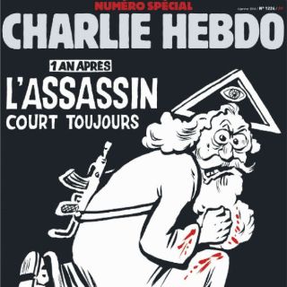 PARÍS, FRANCIA (04/ENE/2016).- En una edición especial llena de blasfemias y obscenidad, escritores y artistas de Charlie Hebdo declararon que la revista satírica francesa sigue viva, pero ''el asesino sigue prófugo''.