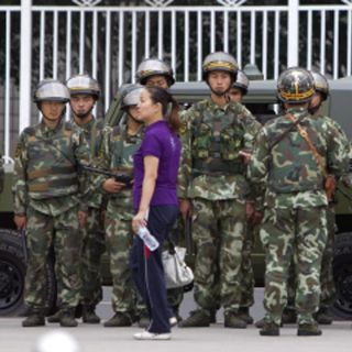 BEIJING, CHINA (19/AGO/2010).- Fuerzas de seguridad patrullan en Urumqi, capital de la región autónoma china de Xinjiang Uighur. El país prometió billones de dólares de inversión en esta región occidental con el interés de encarrilar de nuevo a la zona después de las tensiones entre la etnia musulmán Uighur y la mayoría Han.