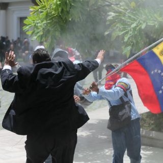 Los partidarios de Maduros se encontraban frente al edificio legislativo en un "plantón" de seis horas en rechazo a la oposición, pero durante un receso de la sesión solemne forzaron el portón y lograron llegar hasta los pasillos y entradas a los salones.