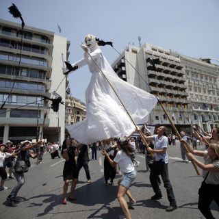 Activistas franceses también actuaron con un títere de tres metros que representaba a la Justicia ensangrentada bailando al ritmo de los tambores, en un gesto de solidaridad con los manifestantes griegos que han acampado en la plaza durante tres semanas.
